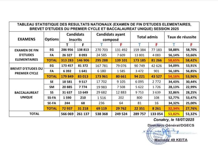 Le ministère de l’Enseignement pré-universitaire et de l’Alphabétisation a publié ce samedi les résultats du Baccalauréat unique session 2025 derniers des examens nationaux. Les statistiques globales révèlent un taux de réussite de 53,82 %, tous examens confondus, soit 133 054 admis sur 538 368 candidats ayant effectivement composé.