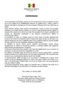 Le communiqué évoque également la situation des ressortissants sénégalais détenus au Maroc à la suite des incidents survenus lors de la finale de la Coupe d’Afrique des Nations. Le gouvernement assure suivre ce dossier de près et réaffirme sa solidarité envers ses citoyens.