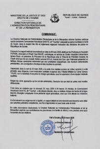 Selon le communiqué, il est décédé à 4 h 35 à l’hôpital militaire du camp Samory Touré. Il purgeait une peine à la maison d’arrêt de Coyah.